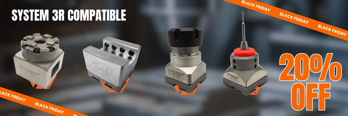 From chucks and holders to vises, pallets, probes, and fixtures — RHS offers the complete System 3R-compatible lineup, now 20 % OFF for a limited time.